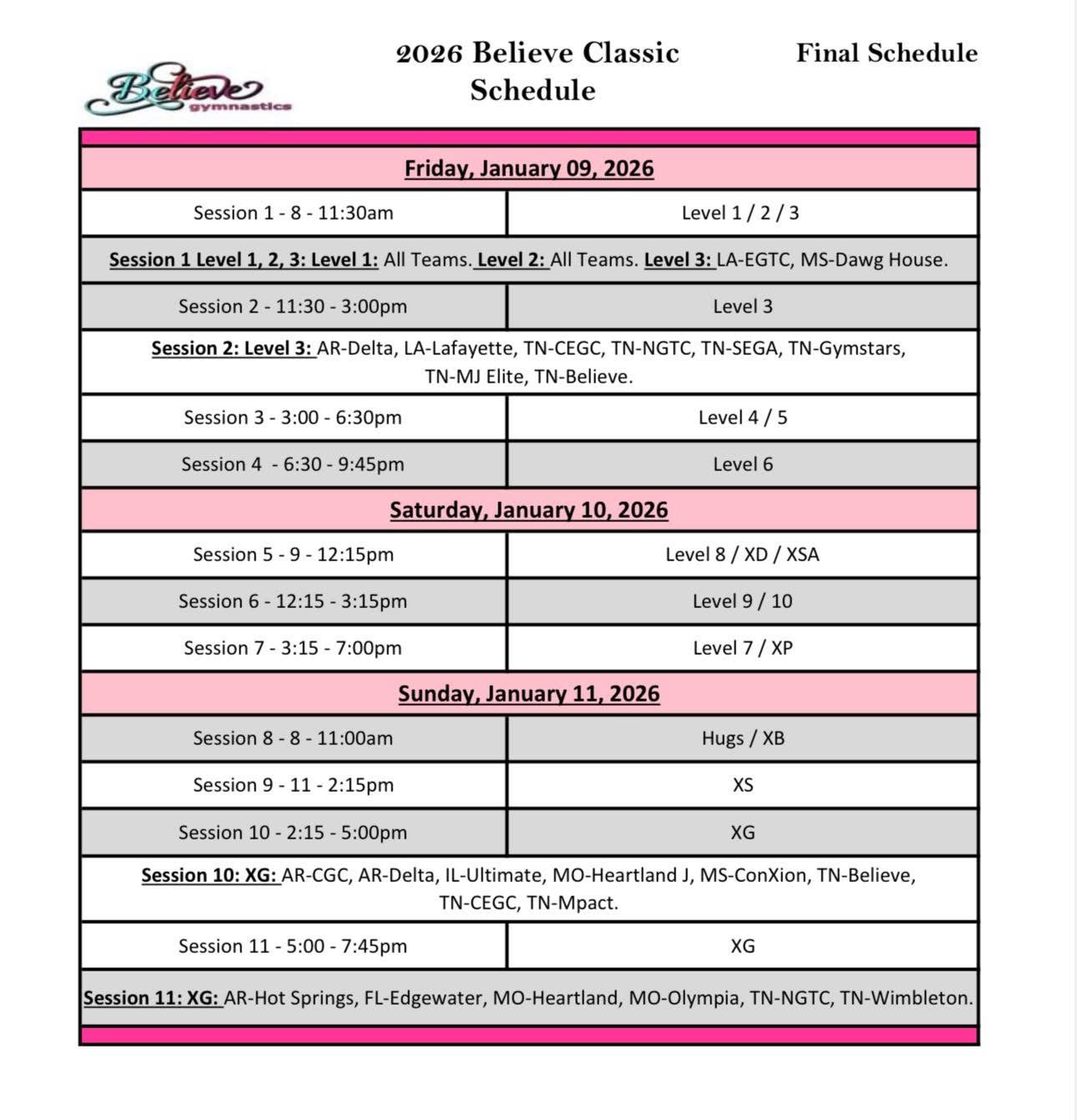 No refunds. Please submit all correspondence and change requests to info@believegymnastics.org.